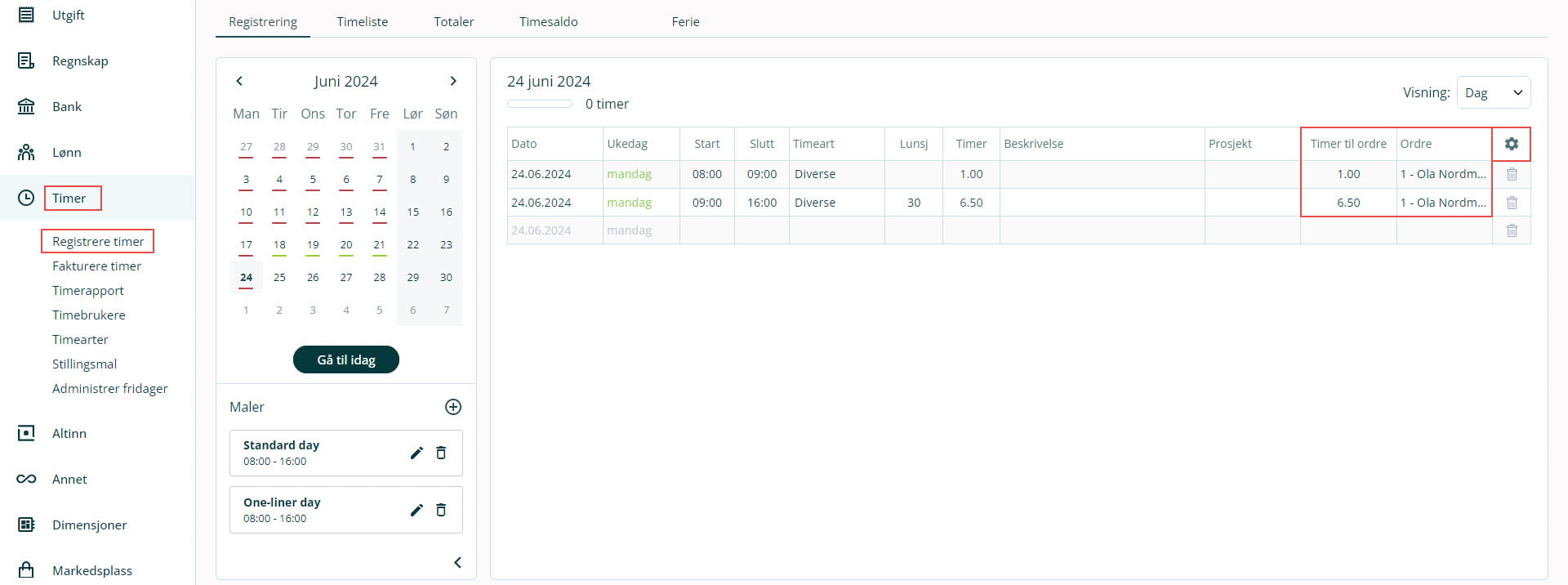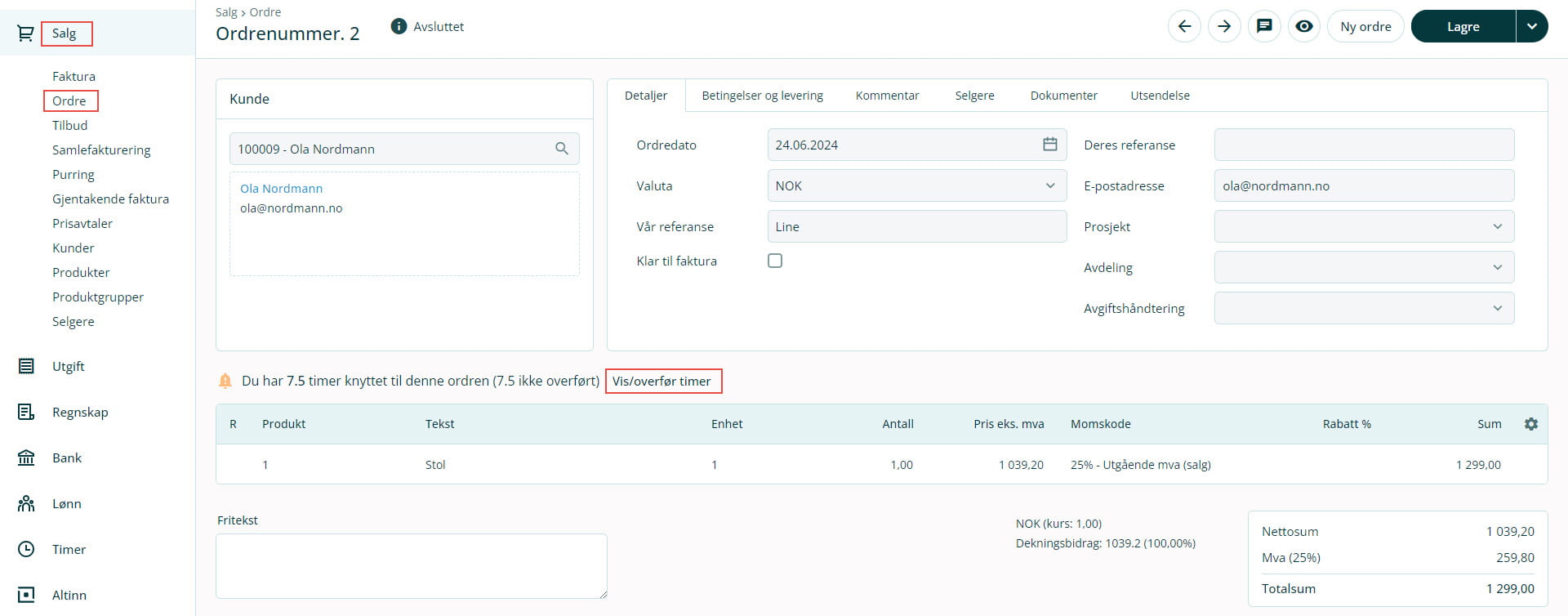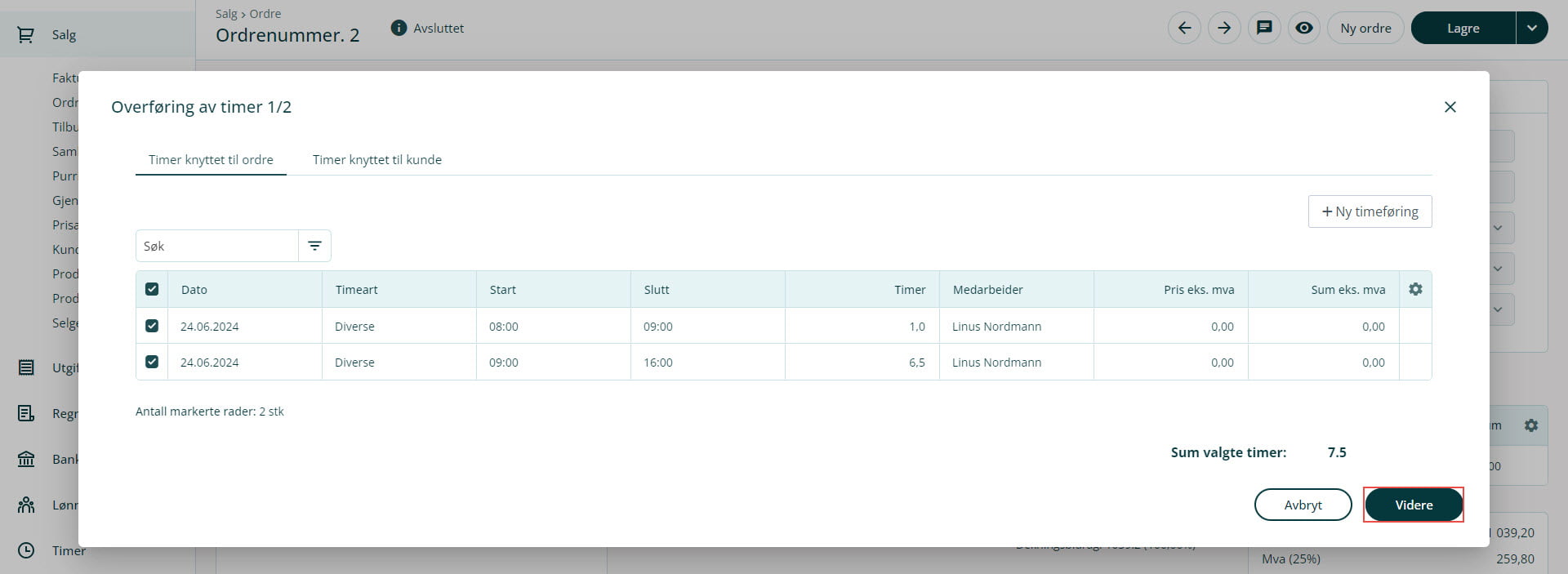 Tips: Du kan også benytte funksjonen Fakturering av timer for å overføre timer til ordre.