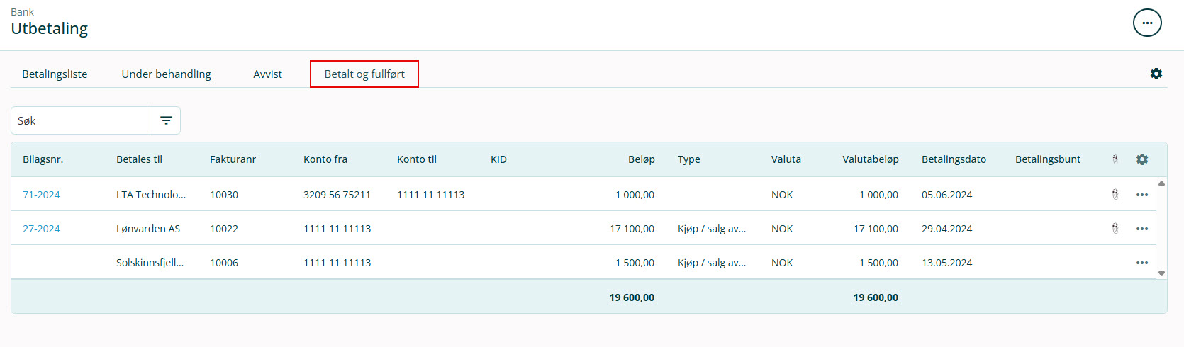 Under denne fanen finner du betalingsposter som er betalt i banken og bokført i systemet basert på avregningsreturen fra banken. Du kan enkelt navigere tilbake til de tilhørende bilagene for ytterligere detaljer.