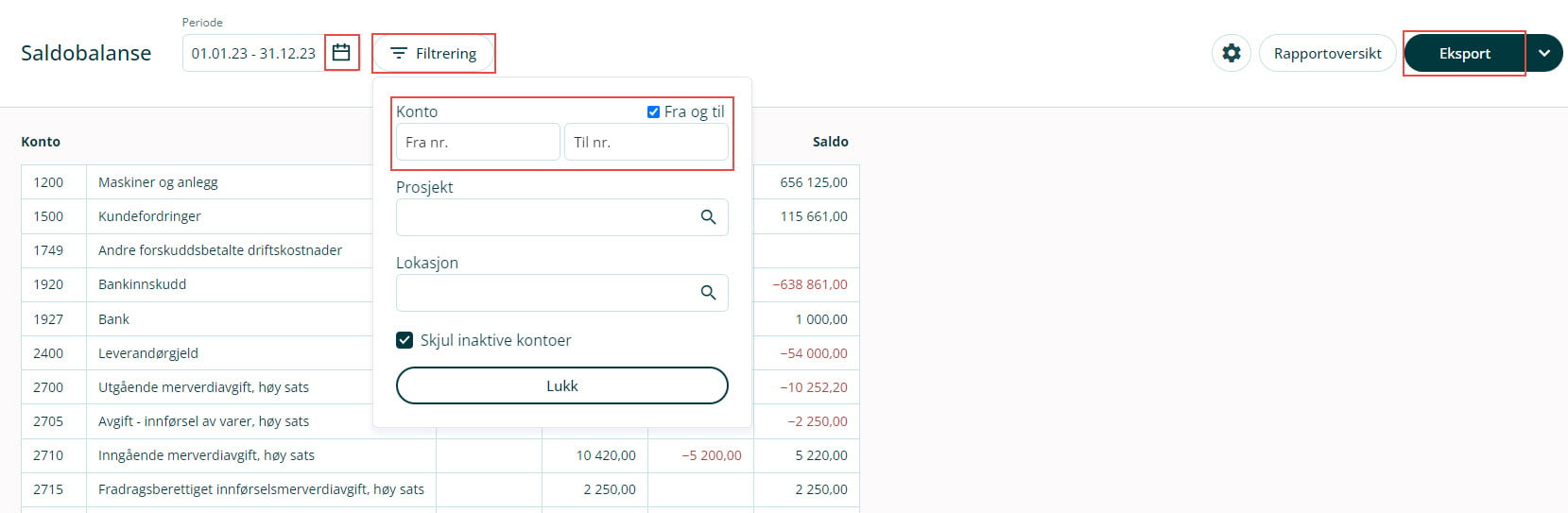 3. Klikk på Filtrer, sett hake ved ☑ Fra og til og velg fra den første kontoen i kontoplanen til den siste.