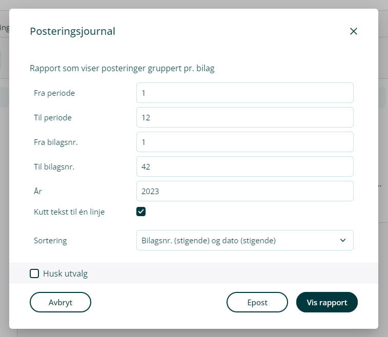 2. Fyll inn parameterne (fra og til bilagsnummer vil være alle bilag som er innenfor inneværende år).