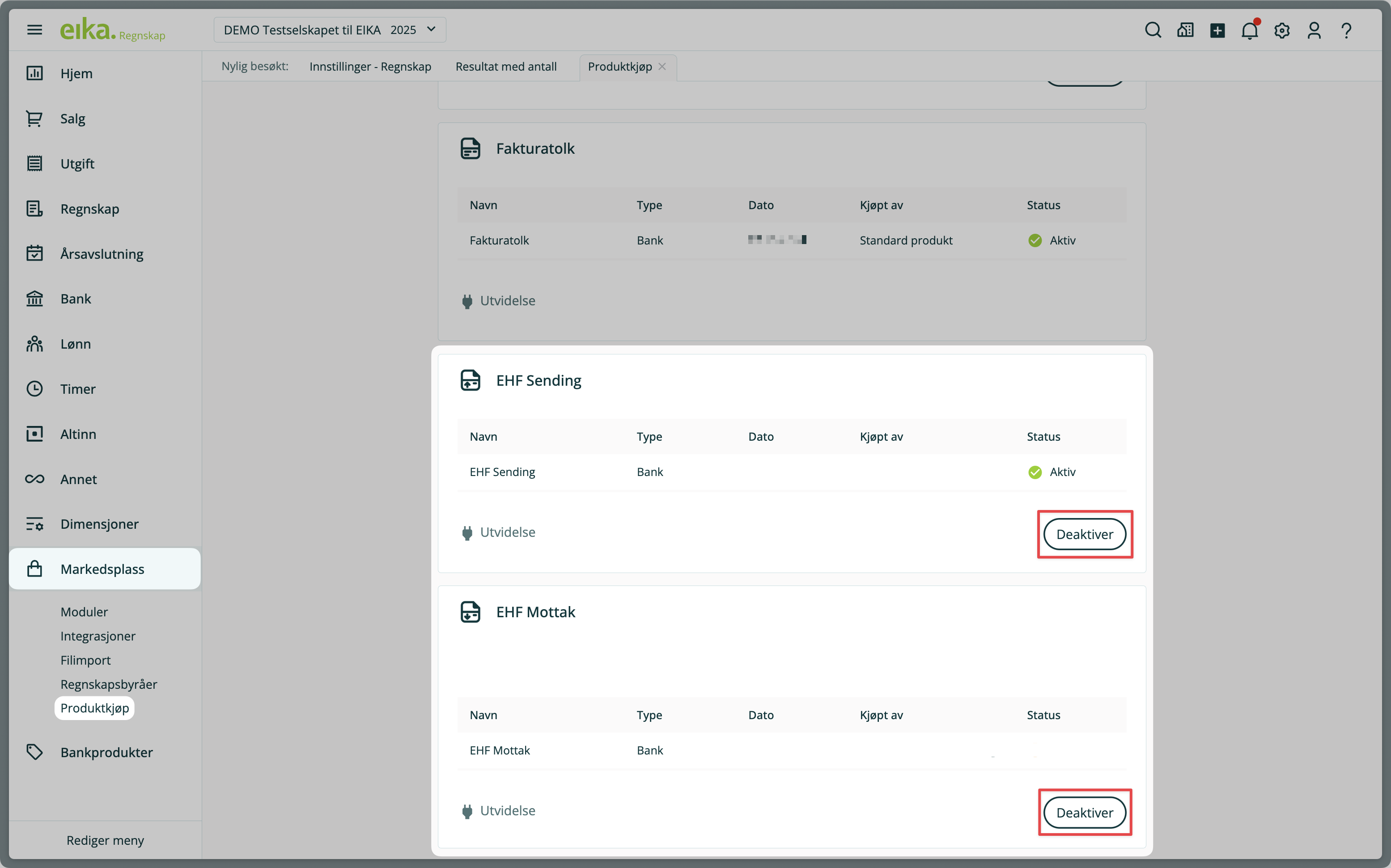 2. Klikk på Deaktiver på EHF/EHF-utsendelse.