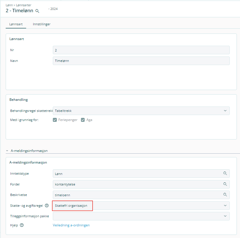 Dersom Skattefri organisasjon er aktivert i lønnsinnstillinger, og du benytter lønnsarter med dette i feltet for Skatte- og avgiftsregel på lønnsartens A-meldingsinformasjon, vil Skatteetaten kunne skille ut lønn fra disse organisasjonsnumrene. På denne måten håndteres grensen på 10 000 kroner for oppgaveplikt automatisk. Når du først har benyttet regelen for skattefri organisasjon må du gjøre det fra første krone og for alle utbetalinger hele året.