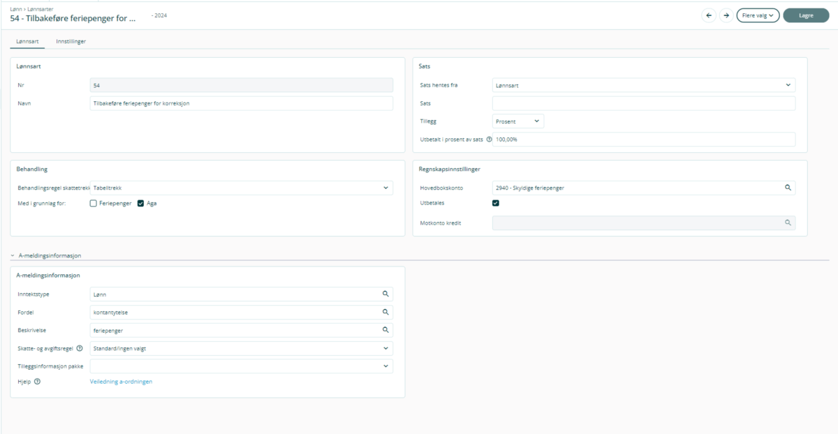 4. Opprett lønnsart 54 - Tilbakeføre feriepenger for korreksjon. Den er helt lik lønnsart 51 - Feriepenger forr.år og brukes til å tilbakeføre det som allerede ligger på feriepengelisten.