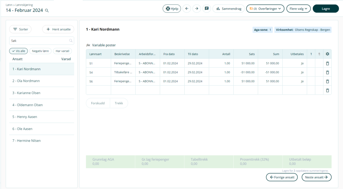 Du har nå oppdatert feriepengelisten (lønnsposten i lønnsart 51), nullstilt innberetningen som følger feriepengeposten (den negative lønnsposten i lønnsart 54), og innberettet beløpet på korrekt måte (lønnsposten i lønnsart 56).