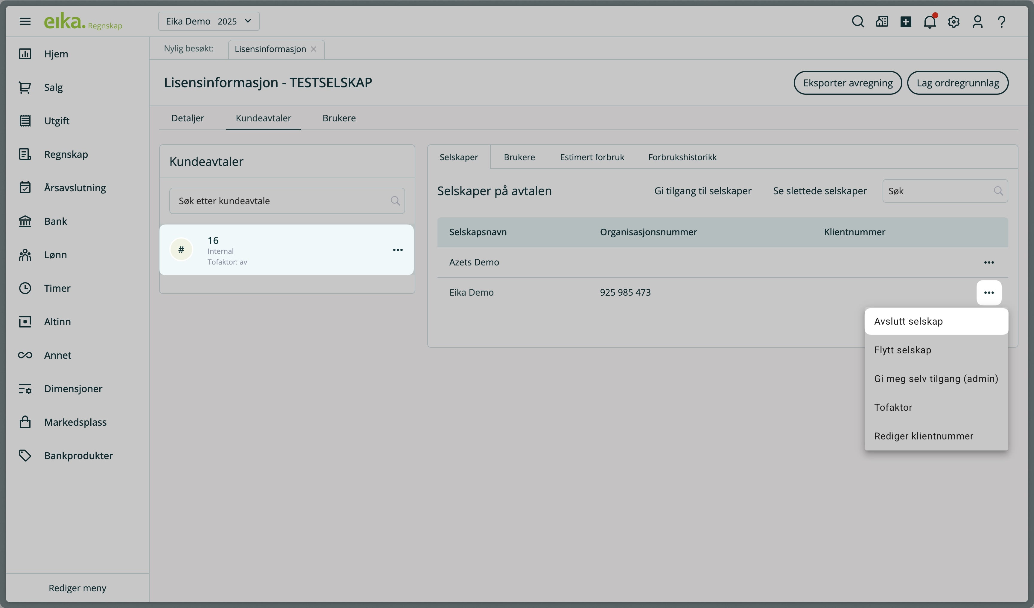 2. Velg kundeavtalen som selskapet tilhører, klikk på ⋯ de tre kulepunktene tilhørende selskapet du ønsker å avslutte, og velg Avslutt selskap.