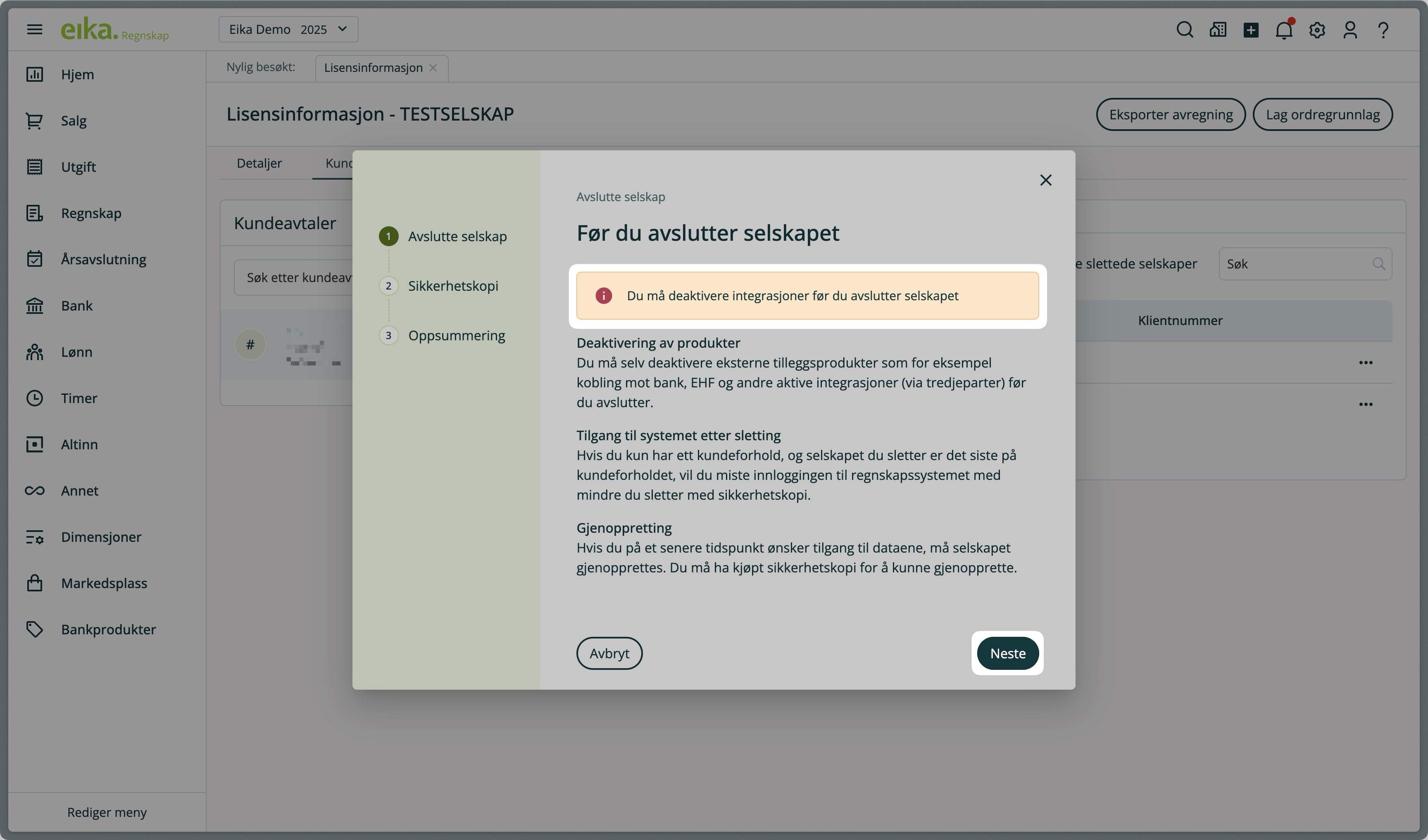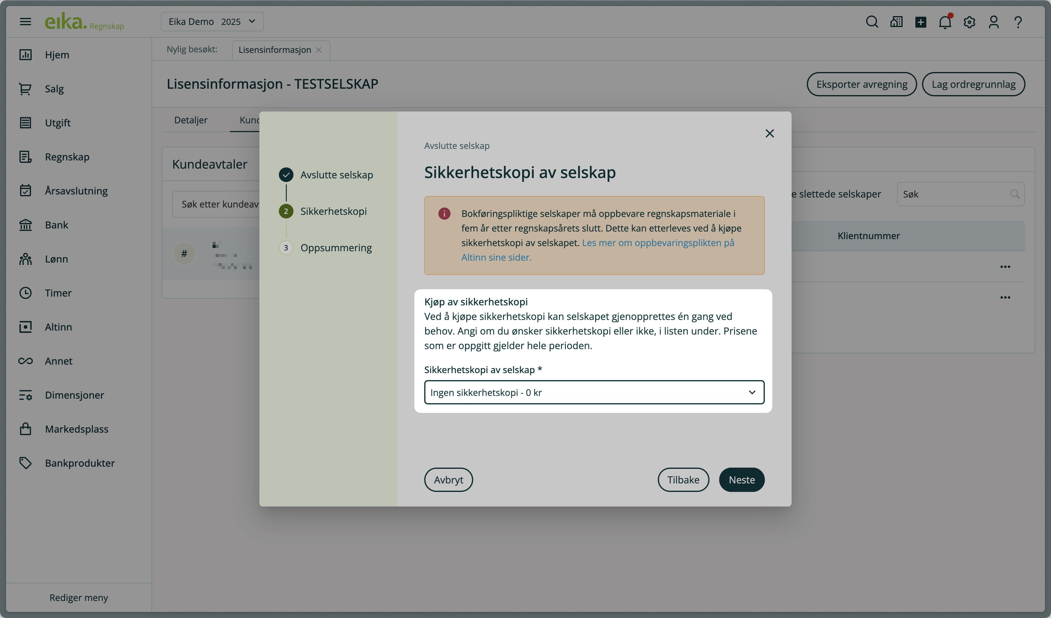 Når du avslutter/sletter et selskap i Eika Regnskap, kan du velge å kjøpe sikkerhetskopi (backup) av selskapet i 5 år eller 10 år. Kjøp av sikkerhetskopi lar deg gjenopprette selskapet én gang ved behov. Kjøpet belastes én gang, og faktureres forskuddsvis mot kundeavtalen som selskapet tilhører. Det koster 300 kr for sikkerhetskopi i 5 år, og 600 kr for sikkerhetskopi i 10 år. Prisene som er oppgitt gjelder for hele perioden.