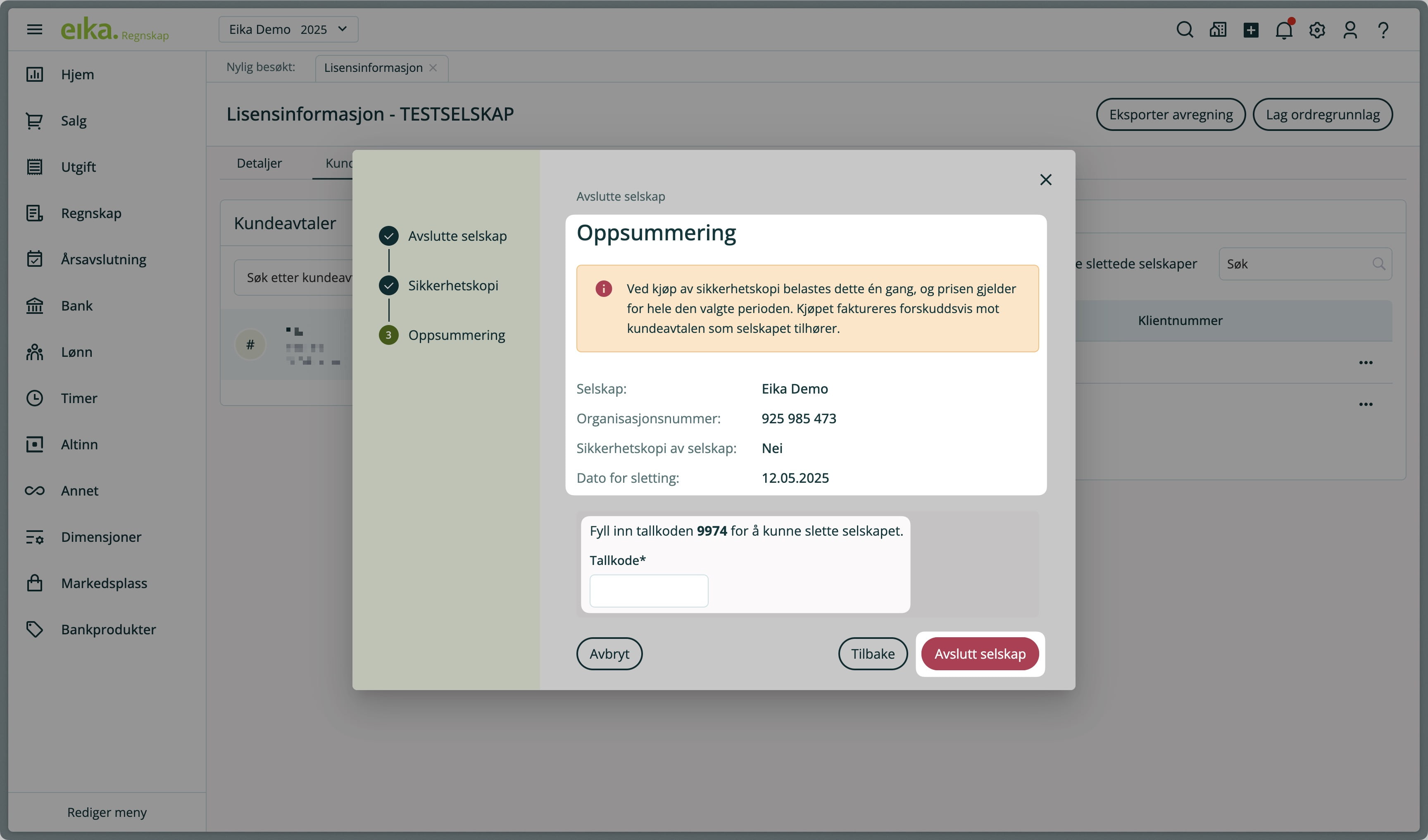 5. Du får nå en oppsummering av valgene dine. Fyll inn tallkoden og klikk på Avslutt selskap. Selskapet vil da slettes med det samme.