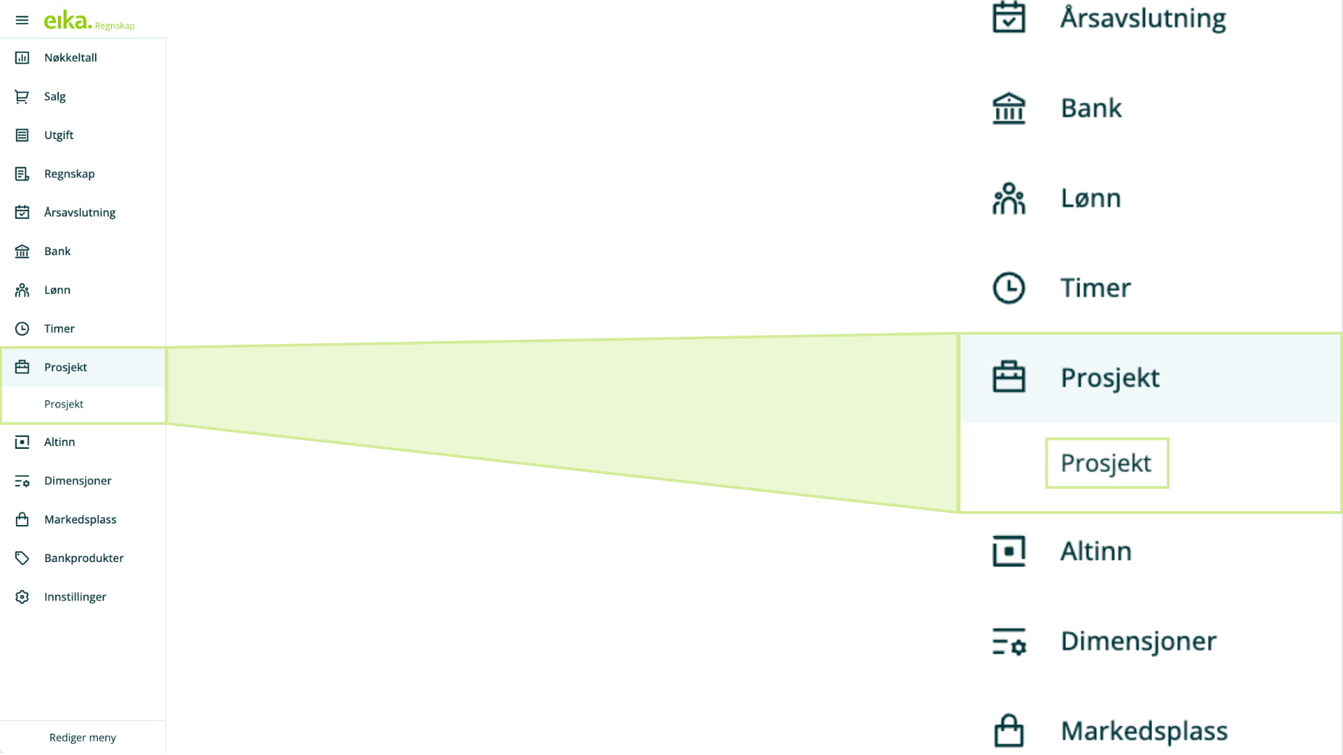 Prosjekt-modulen blir nå tilgjengelig og synlig i sidemenyen for alle pakker i Eika Regnskap.